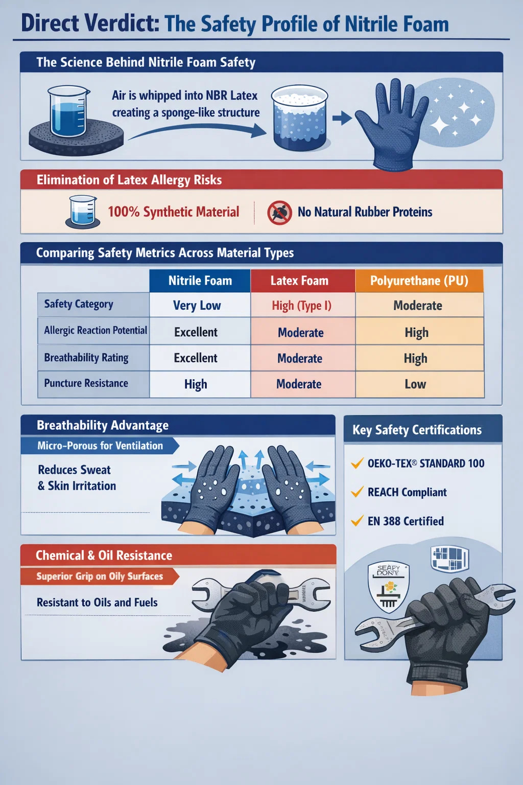 Para responder la pregunta directamente: Sí, la espuma de nitrilo es excepcionalmente segura para la gran mayoría de las personas y, a menudo, es la opción preferida para quienes tienen piel sensible. Debido a que es un material 100% sentético, no contiene ninguna de las proteínas del caucho natural que causan alergias al látex. Además, espuma de nitrilo es químicamente inerte una vez curado, lo que significa que no libera humos tóxicos ni residuos nocivos durante el uso estándar, lo que lo convierte en un estándar de la industria para equipos de protección.