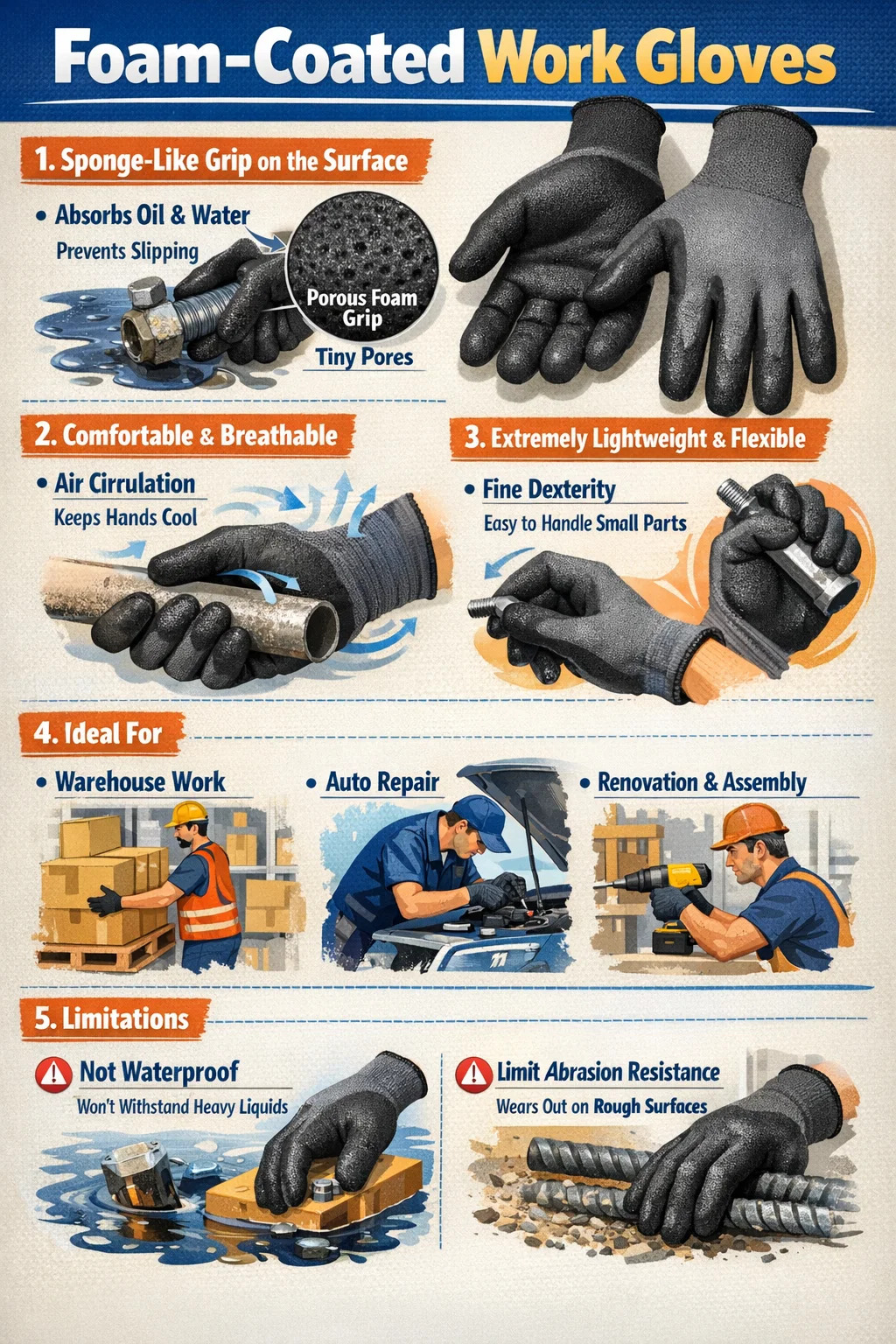 guantes de espuma no significa que todo el guante esté hecho de espuma; más bien, se refieren a guantes de tela normales recubiertos con una capa de caucho o polímero especialmente tratada que contiene poros diminutos.