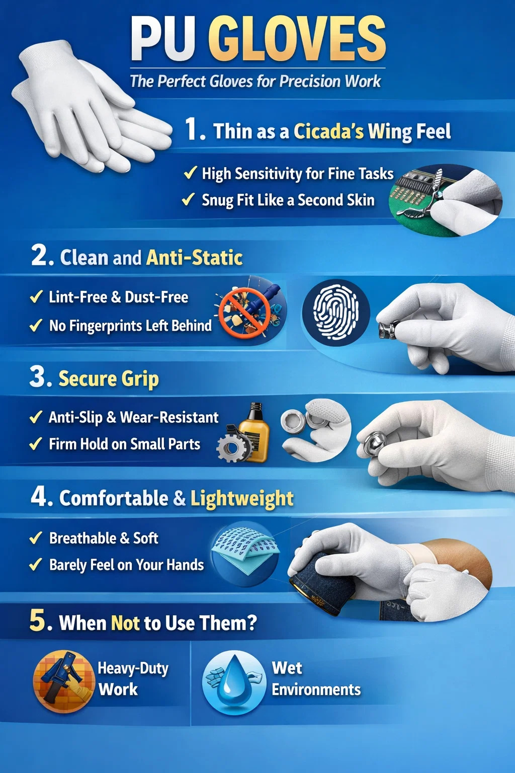 Antiestático y libre de polvo: este material en sí no es propenso a generar polvo, lo que lo convierte en la opción preferida para fábricas de electrónica y ensamblaje de instrumentos de precisión. Si estás reparando un teléfono móvil, montando una computadora o limpiando lentes costosos en casa, usar estos guantes protectores protegerá tus manos sin ensuciar las piezas.