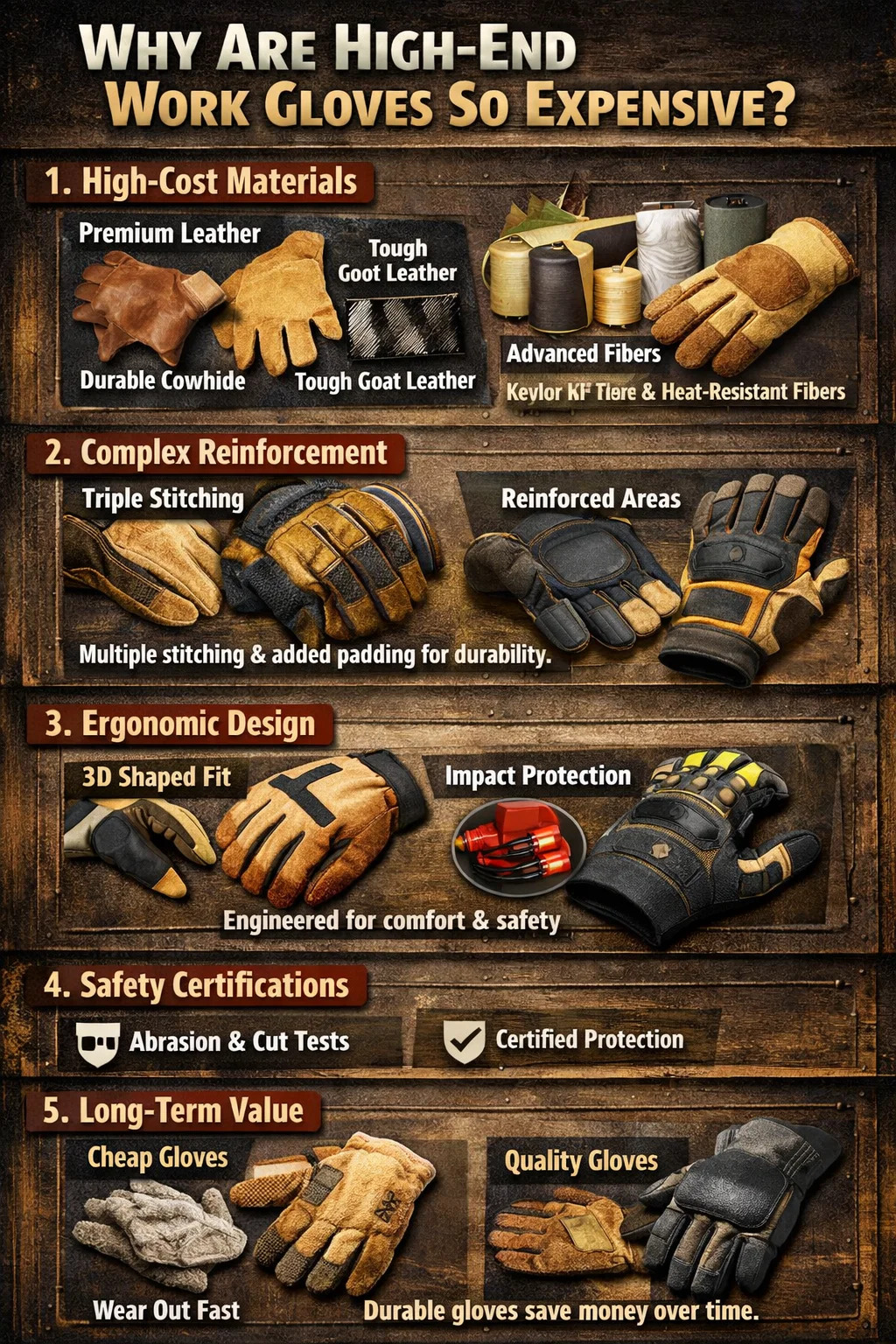 Un par de guantes baratos que cuestan unos pocos dólares pueden agujerearse después de solo un día de trabajo, lo que le obligará a comprar reemplazos constantemente. Sin embargo, un par de guantes de trabajo de alta calidad que duren seis meses pueden terminar costando menos por día que los más baratos. Este valor a largo plazo derivado de la durabilidad es otra razón del precio superior.