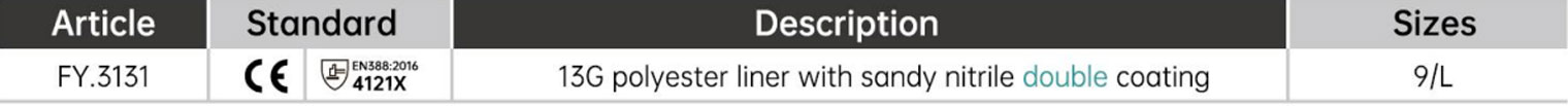 El revestimiento de palma con acabado arenoso de nitrilo doble ofrece alta resistencia al aceite y buen agarre en condiciones secas, húmedas y aceitosas.